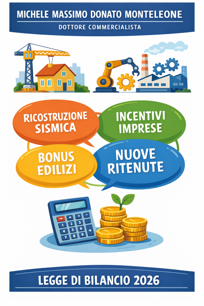 Lo Studio del Dott. Michele Massimo Donato Monteleone offre servizi di consulenza fiscale, tributaria e societaria ad aziende, professionisti e privati su tutto il territorio nazionale. Con sedi ad Aosta e Catania, lo studio è punto di riferimento per chi cerca un commercialista capace di unire competenza tecnica, aggiornamento normativo e approccio strategico. Tra le specializzazioni: pianificazione fiscale, assistenza nei rapporti con l’Agenzia delle Entrate, operazioni straordinarie e gestione dei crediti d’imposta. Lo studio ha recentemente pubblicato una serie di approfondimenti sulla Legge di Bilancio 2026, contribuendo con analisi puntuali e concrete alla comprensione delle nuove misure fiscali introdotte.